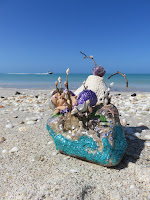 For those of you who look forward to my featured Gifts From The Sea and Other Treasures, please enjoy the feeling and detail of Mermaid Rock Enchantment ~ This Handcrafted OOAK Little Amethyst Mermaid enjoys sleeping in the sun on Mermaid Rock. She is hand-painted with fine detail from silver head to tail. She basks on a beautiful rock with a natural coral "mountain" atop. Crowning the coral is a stunning, authentic amethyst crystal - acquired by yours truly on a beach in Ecuador. Surrounding this cute siren are shell trees and "moss". Glittery blue waves splash the base. Rhinestones and bling capture the light increasing the enchantment. Gorgeous Beach Décor for yourself or that Little Mermaid in your life! Please contact to acquire.